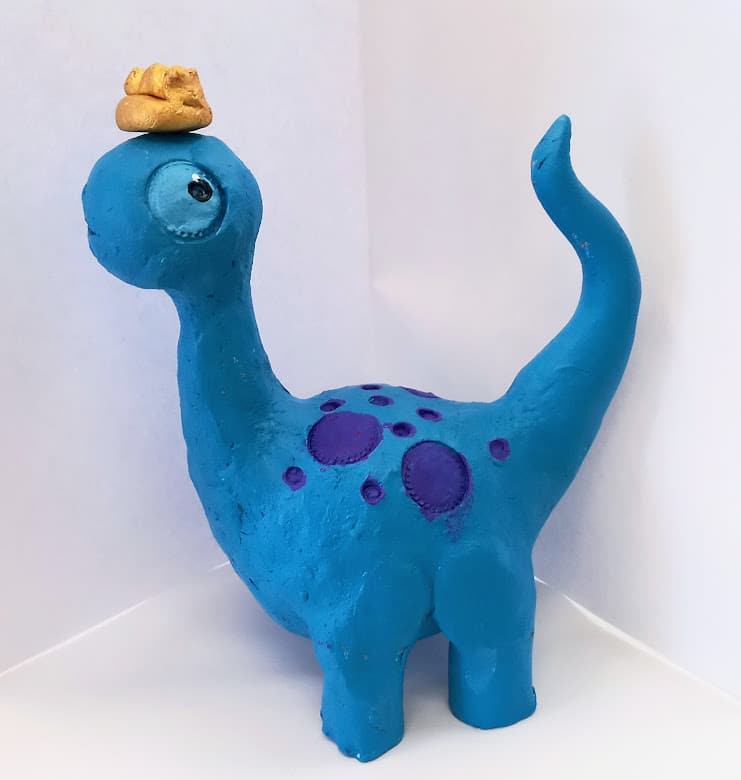 dinosaur wearing a crown , with blue spots clay sculpture painted in acrylics, for kids 5-8 yrs